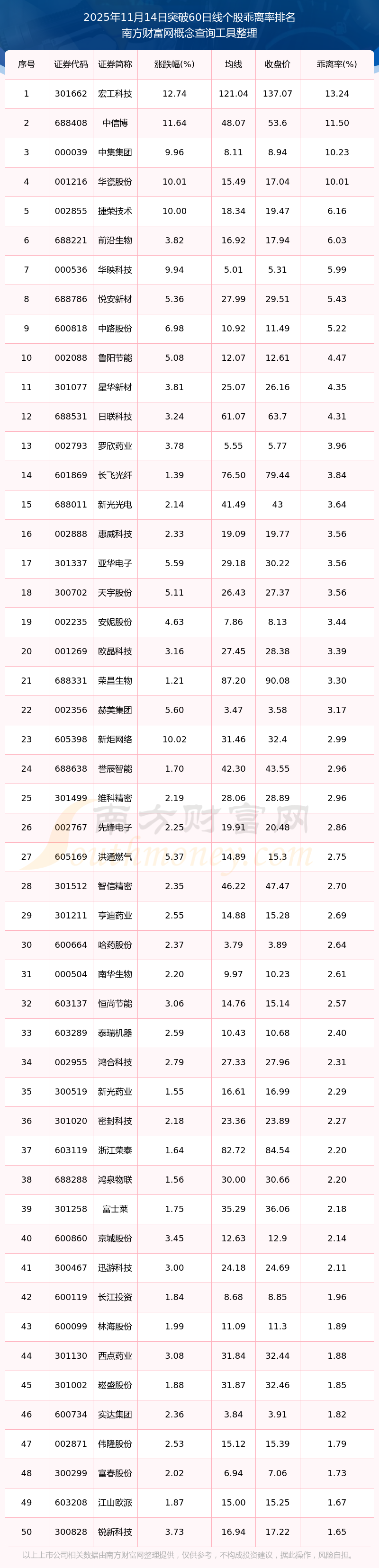 2025年11月14日突破60日線個(gè)股乖離率排名