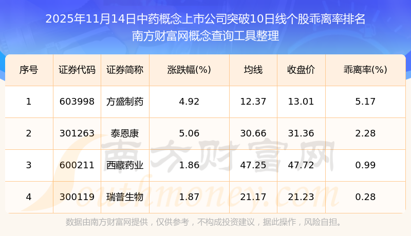 根據(jù)南方財富網(wǎng)概念查詢工具數(shù)據(jù)統(tǒng)計,截止2025年11月14日收盤,中藥概念上市公司共有4只個股收盤價向上突破了10日線。其中乖離率較大的個股有方盛制藥、泰恩康、西藏藥業(yè)等,乖離率分別為5.17%、2.28%、0.99%。