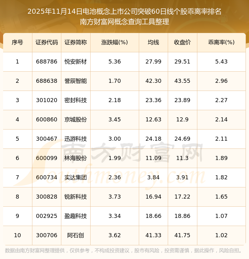 2025年11月14日電池概念上市公司突破60日線個(gè)股乖離率排名