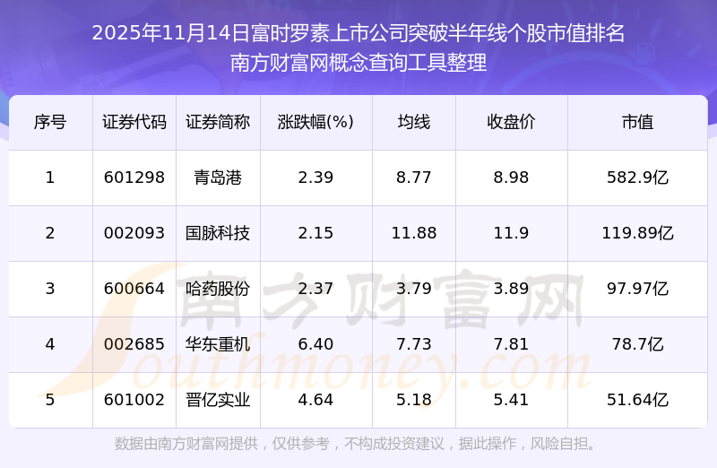2025年11月14日富時羅素上市公司突破半年線個股市值排名