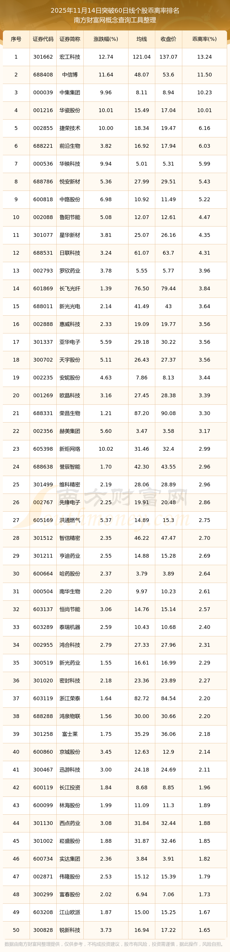 2025年11月14日突破60日線個(gè)股乖離率排名