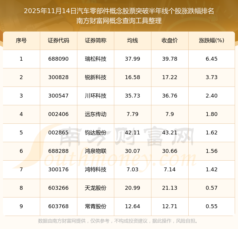 根據(jù)南方財(cái)富網(wǎng)概念查詢工具數(shù)據(jù)統(tǒng)計(jì),截止2025年11月14日收盤,汽車零部件概念股票共有9只個(gè)股收盤價(jià)向上突破了半年線。其中漲幅較大的個(gè)股有瑞松科技、銳新科技、川環(huán)科技等,漲幅分別為6.45%、3.73%、2.40%。