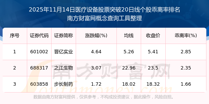 2025年11月14日醫(yī)療設(shè)備股票突破20日線個(gè)股乖離率排名