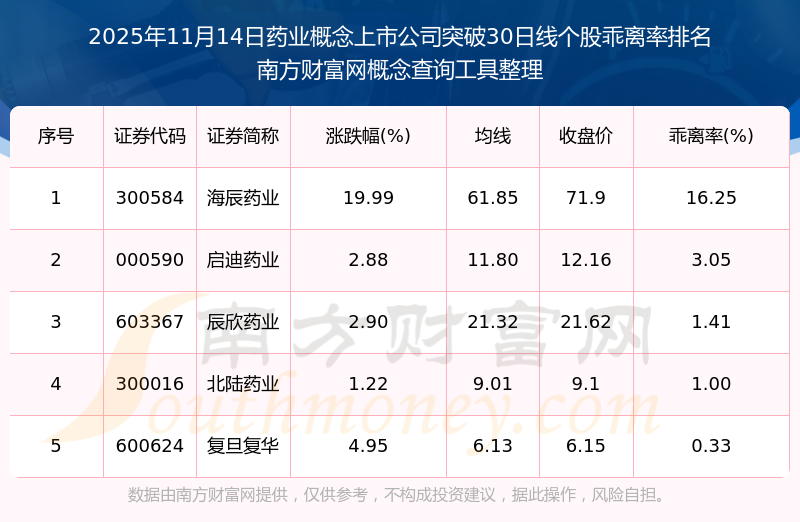 2025年11月14日藥業(yè)概念上市公司突破30日線個股乖離率排名