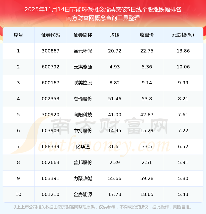 2025年11月14日節(jié)能環(huán)保概念股票突破5日線個(gè)股漲跌幅排名
