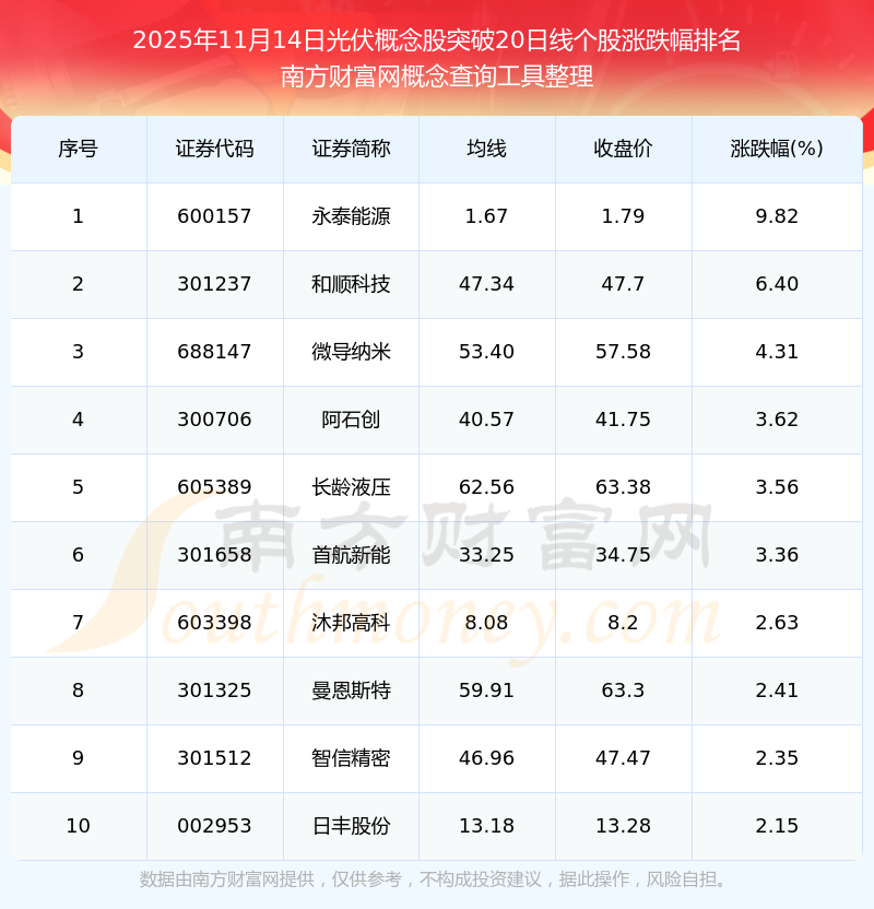 根據(jù)南方財富網(wǎng)概念查詢工具數(shù)據(jù)統(tǒng)計,截止2025年11月14日收盤,光伏概念股共有13只個股收盤價向上突破了20日線。其中漲幅較大的個股有永泰能源、和順科技、微導(dǎo)納米等,漲幅分別為9.82%、6.40%、4.31%。