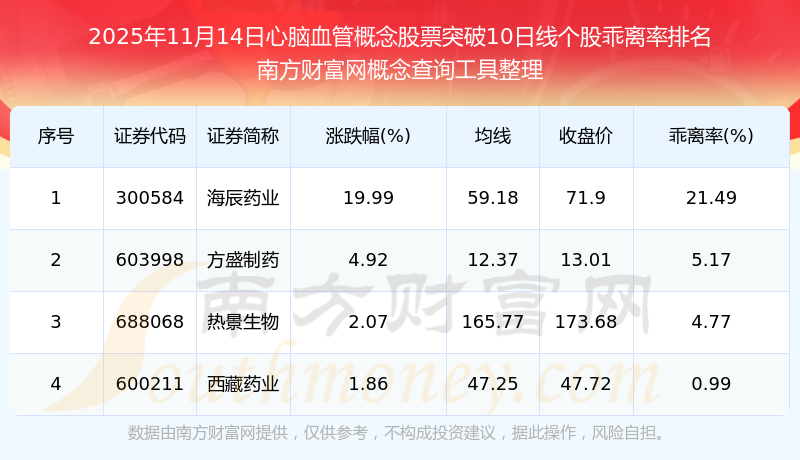2025年11月14日心腦血管概念股票突破10日線個(gè)股乖離率排名