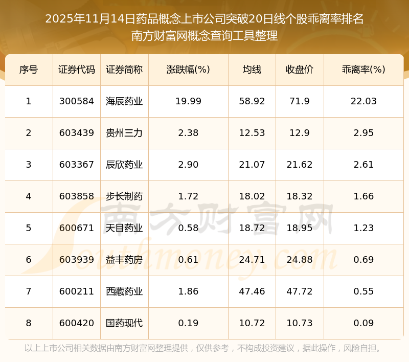 根據(jù)南方財富網(wǎng)概念查詢工具數(shù)據(jù)統(tǒng)計,截止2025年11月14日收盤,藥品概念上市公司共有8只個股收盤價向上突破了20日線。其中乖離率較大的個股有海辰藥業(yè)、貴州三力、辰欣藥業(yè)等,乖離率分別為22.03%、2.95%、2.61%。