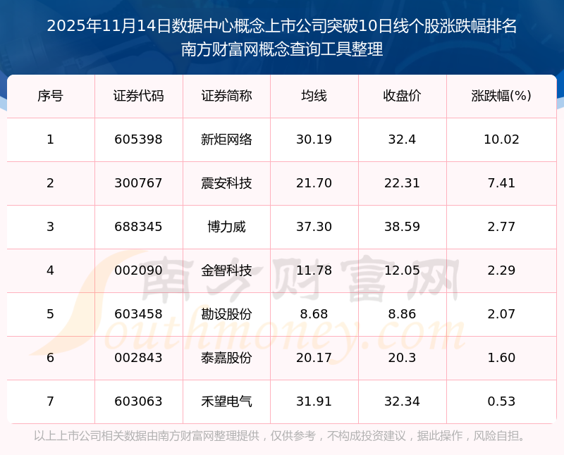 2025年11月14日數(shù)據(jù)中心概念上市公司突破10日線個股漲跌幅排名