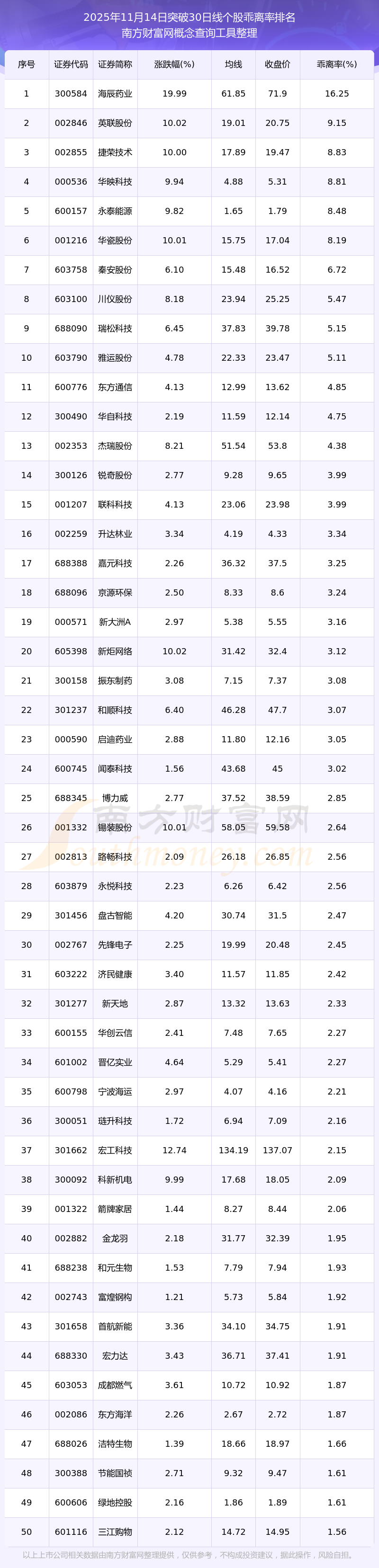 2025年11月14日突破30日線個(gè)股乖離率排名