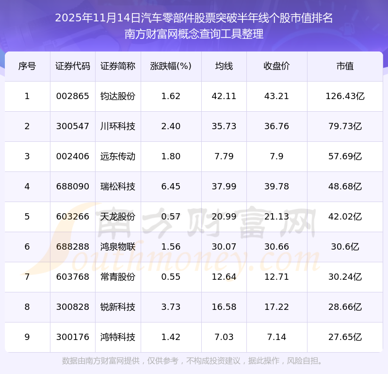 2025年11月14日汽車零部件股票突破半年線個(gè)股市值排名