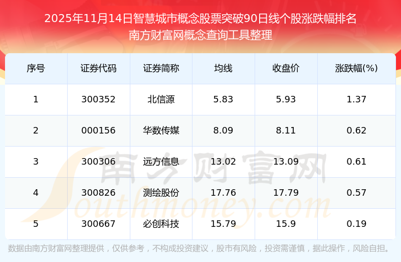 根據(jù)南方財富網(wǎng)概念查詢工具數(shù)據(jù)統(tǒng)計,截止2025年11月14日收盤,智慧城市概念股票共有5只個股收盤價向上突破了90日線。其中漲幅較大的個股有北信源、華數(shù)傳媒、遠(yuǎn)方信息等,漲幅分別為1.37%、0.62%、0.61%。