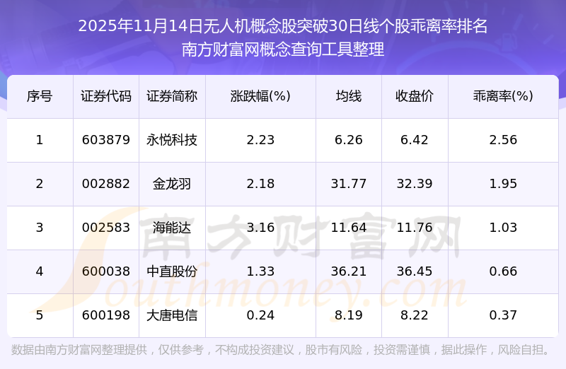 2025年11月14日無(wú)人機(jī)概念股突破30日線個(gè)股乖離率排名
