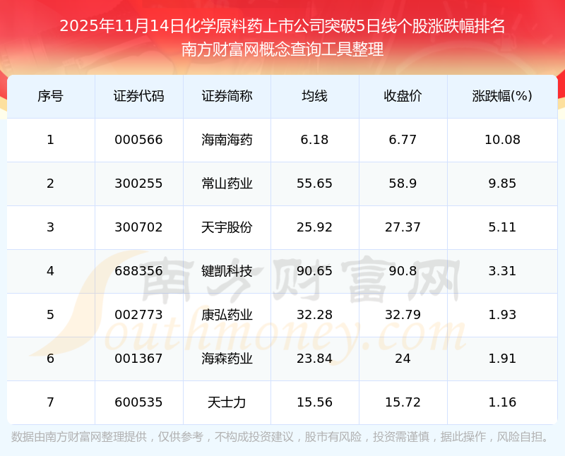 根據(jù)南方財(cái)富網(wǎng)概念查詢(xún)工具數(shù)據(jù)統(tǒng)計(jì),截止2025年11月14日收盤(pán),化學(xué)原料藥上市公司共有7只個(gè)股收盤(pán)價(jià)向上突破了5日線。其中漲幅較大的個(gè)股有海南海藥、常山藥業(yè)、天宇股份等,漲幅分別為10.08%、9.85%、5.11%。