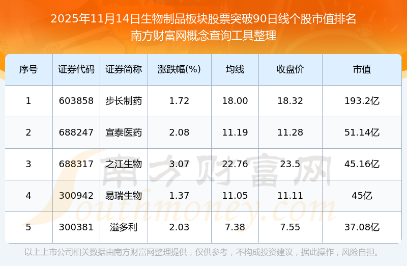 根據(jù)南方財富網(wǎng)概念查詢工具數(shù)據(jù)統(tǒng)計,截止2025年11月14日收盤,生物制品板塊股票共有5只個股收盤價向上突破了90日線。其中市值較大的個股有步長制藥、宣泰醫(yī)藥、之江生物等,市值分別為193.2億、51.14億、45.16億。
