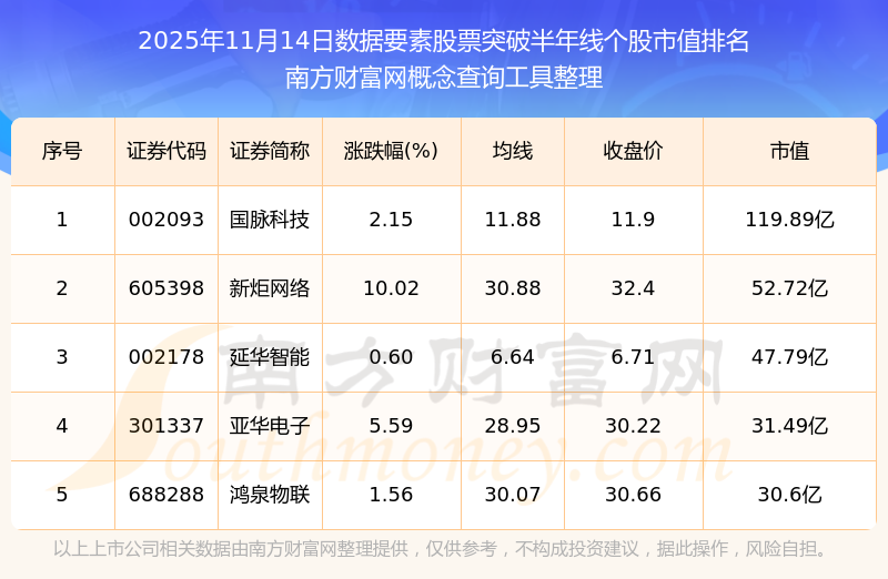 根據(jù)南方財富網(wǎng)概念查詢工具數(shù)據(jù)統(tǒng)計,截止2025年11月14日收盤,數(shù)據(jù)要素股票共有5只個股收盤價向上突破了半年線。其中市值較大的個股有國脈科技、新炬網(wǎng)絡(luò)、延華智能等,市值分別為119.89億、52.72億、47.79億。