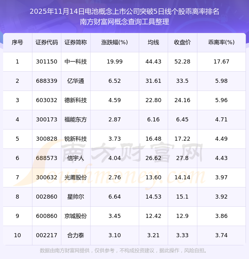 根據(jù)南方財(cái)富網(wǎng)概念查詢工具數(shù)據(jù)統(tǒng)計(jì),截止2025年11月14日收盤,電池概念上市公司共有30只個股收盤價向上突破了5日線。其中乖離率較大的個股有中一科技、億華通、德新科技等,乖離率分別為17.67%、5.98%、5.96%。