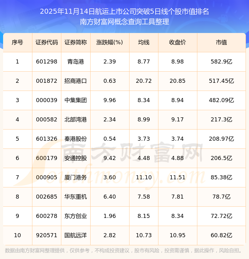 2025年11月14日航運(yùn)上市公司突破5日線個(gè)股市值排名