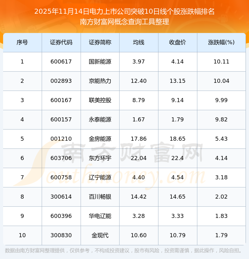 2025年11月14日電力上市公司突破10日線個股漲跌幅排名