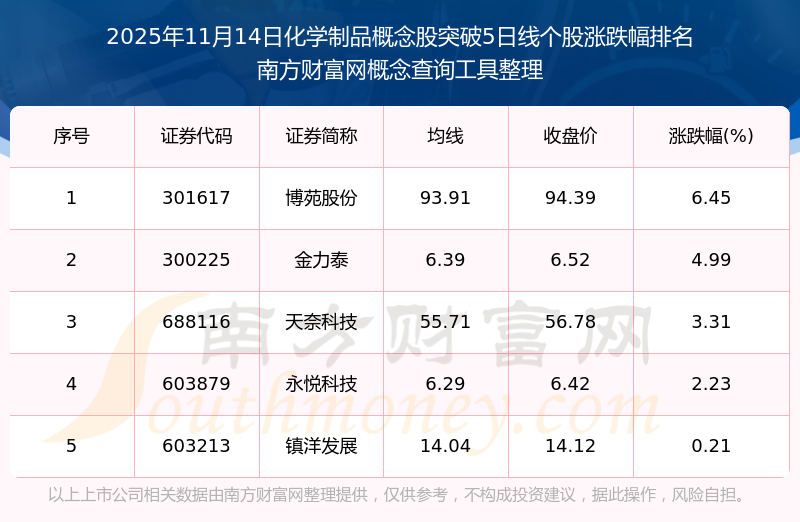 2025年11月14日化學(xué)制品概念股突破5日線個股漲跌幅排名