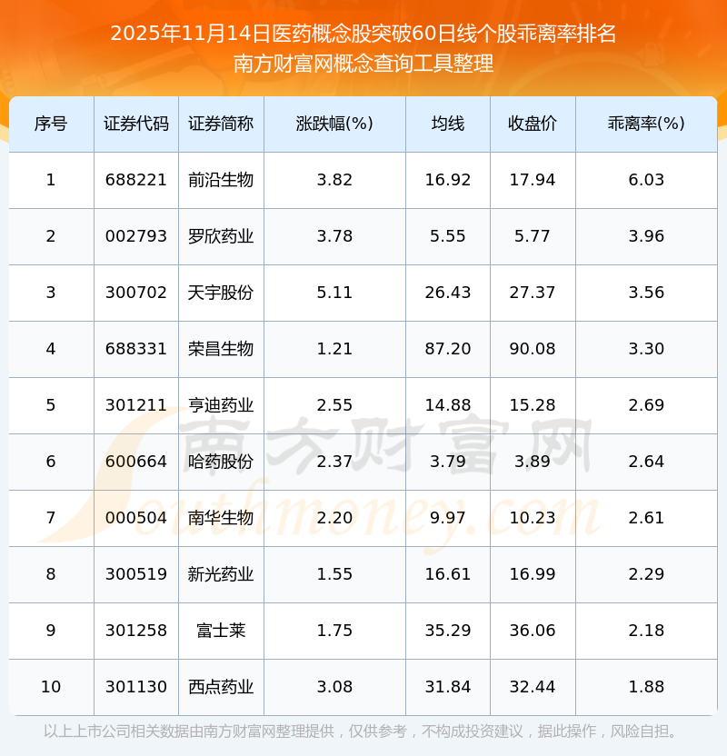 2025年11月14日醫(yī)藥概念股突破60日線個(gè)股乖離率排名