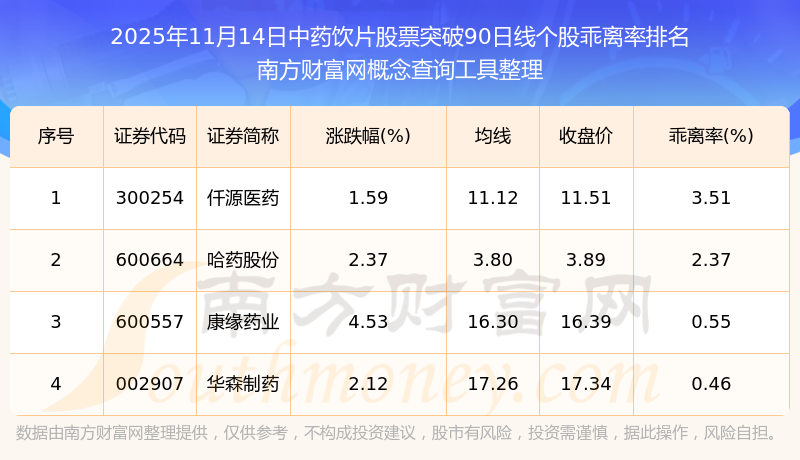 根據(jù)南方財富網(wǎng)概念查詢工具數(shù)據(jù)統(tǒng)計,截止2025年11月14日收盤,中藥飲片股票共有4只個股收盤價向上突破了90日線。其中乖離率較大的個股有仟源醫(yī)藥、哈藥股份、康緣藥業(yè)等,乖離率分別為3.51%、2.37%、0.55%。