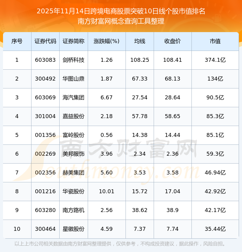 2025年11月14日跨境電商股票突破10日線個(gè)股市值排名