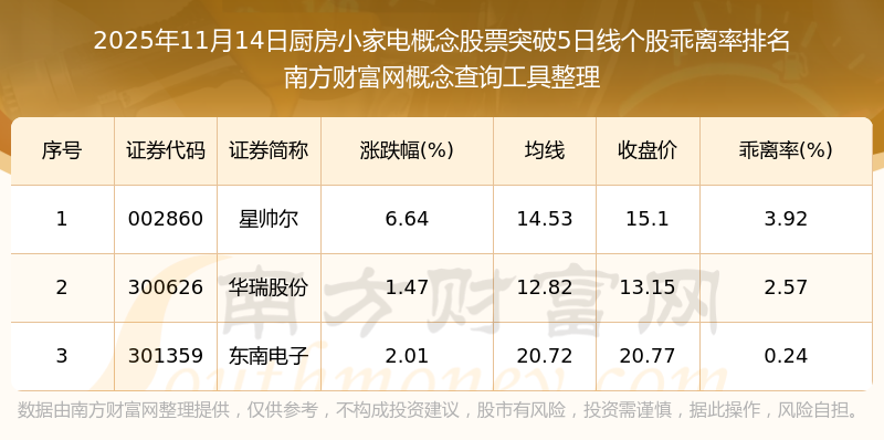 2025年11月14日廚房小家電概念股票突破5日線個(gè)股乖離率排名