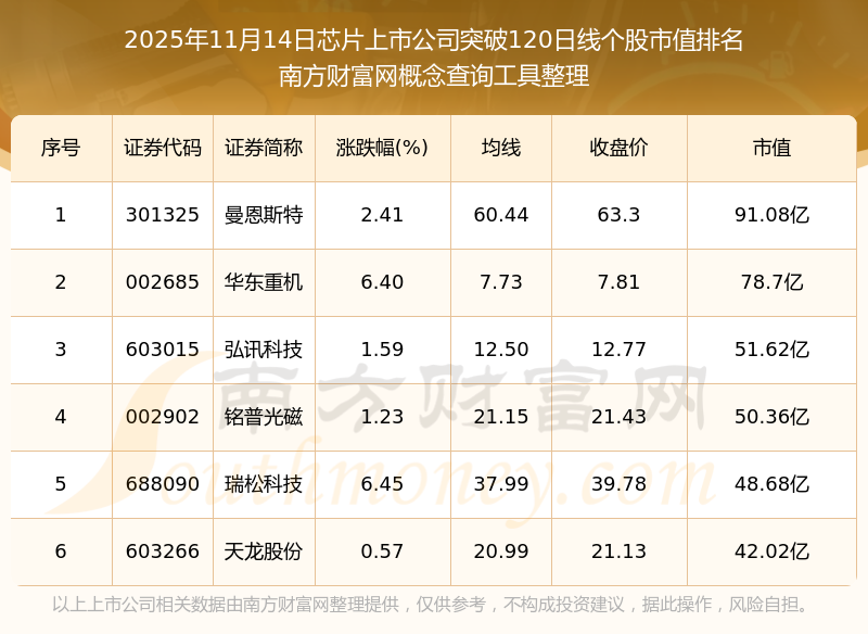 根據(jù)南方財富網(wǎng)概念查詢工具數(shù)據(jù)統(tǒng)計,截止2025年11月14日收盤,芯片上市公司共有6只個股收盤價向上突破了120日線。其中市值較大的個股有曼恩斯特、華東重機、弘訊科技等,市值分別為91.08億、78.7億、51.62億。
