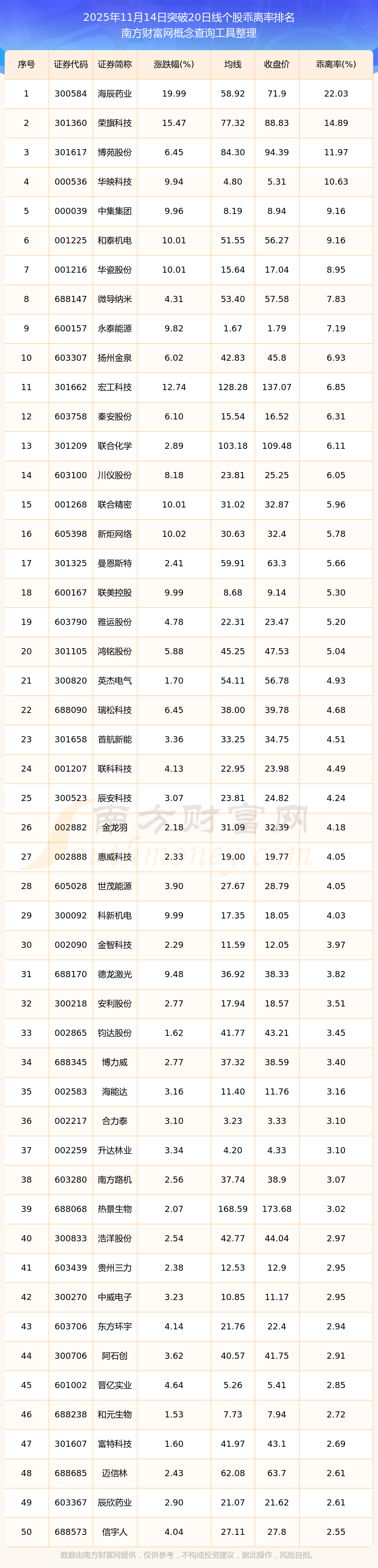 根據(jù)南方財(cái)富網(wǎng)概念查詢工具數(shù)據(jù)統(tǒng)計(jì),截止2025年11月14日收盤,共有108只個股收盤價向上突破了20日線,其中乖離率較大的個股有海辰藥業(yè)、榮旗科技、博苑股份、華映科技、中集集團(tuán)等,乖離率分別為22.03%、14.89%、11.97%、10.63%、9.16%。