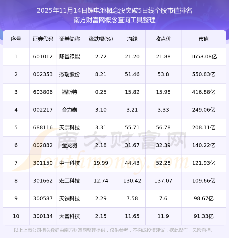 2025年11月14日鋰電池概念股突破5日線個(gè)股市值排名