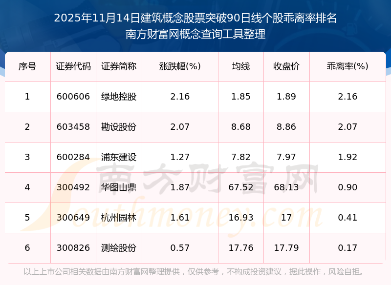 根據(jù)南方財富網(wǎng)概念查詢工具數(shù)據(jù)統(tǒng)計,截止2025年11月14日收盤,建筑概念股票共有6只個股收盤價向上突破了90日線。其中乖離率較大的個股有綠地控股、勘設(shè)股份、浦東建設(shè)等,乖離率分別為2.16%、2.07%、1.92%。