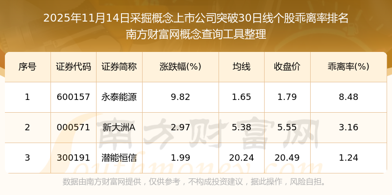 2025年11月14日采掘概念上市公司突破30日線(xiàn)個(gè)股乖離率排名