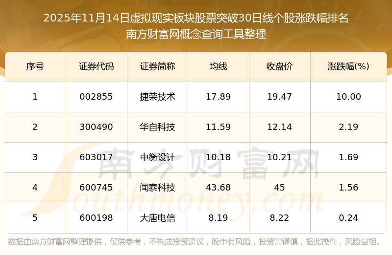 2025年11月14日虛擬現(xiàn)實板塊股票突破30日線個股漲跌幅排名