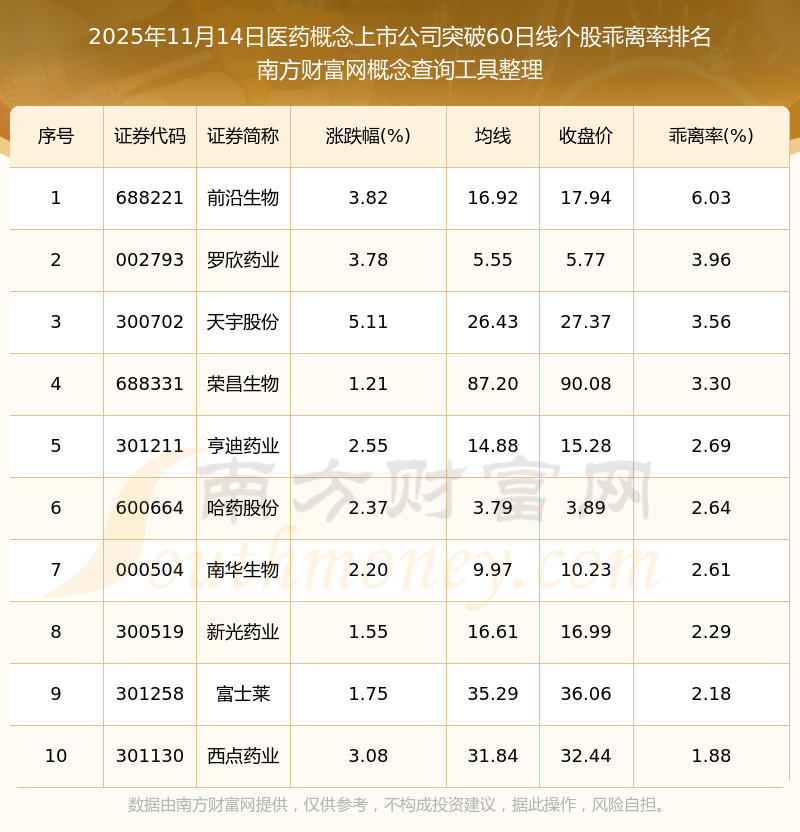 2025年11月14日醫(yī)藥概念上市公司突破60日線個股乖離率排名