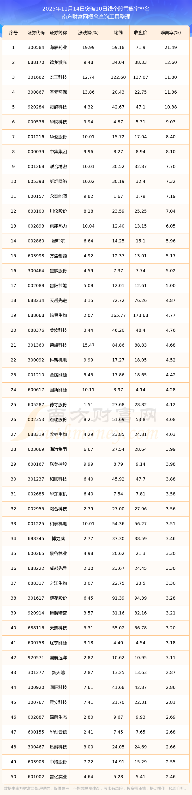 2025年11月14日突破10日線個(gè)股乖離率排名