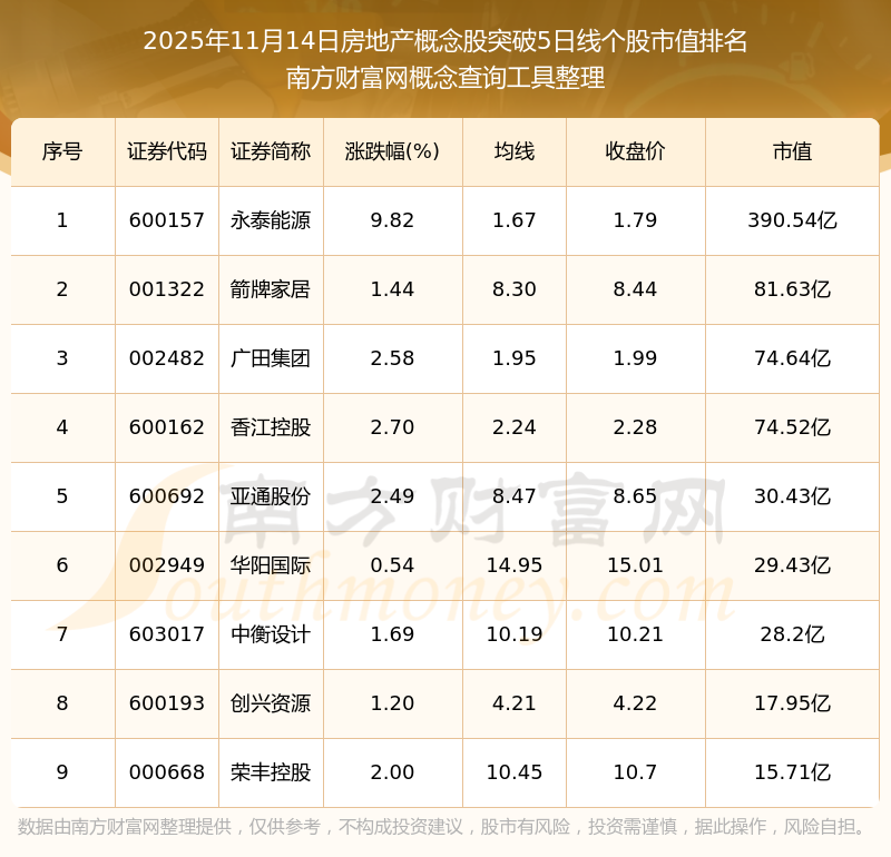 根據(jù)南方財(cái)富網(wǎng)概念查詢工具數(shù)據(jù)統(tǒng)計(jì),截止2025年11月14日收盤,房地產(chǎn)概念股共有9只個(gè)股收盤價(jià)向上突破了5日線。其中市值較大的個(gè)股有永泰能源、箭牌家居、香江控股等,市值分別為390.54億、81.63億、74.85億。