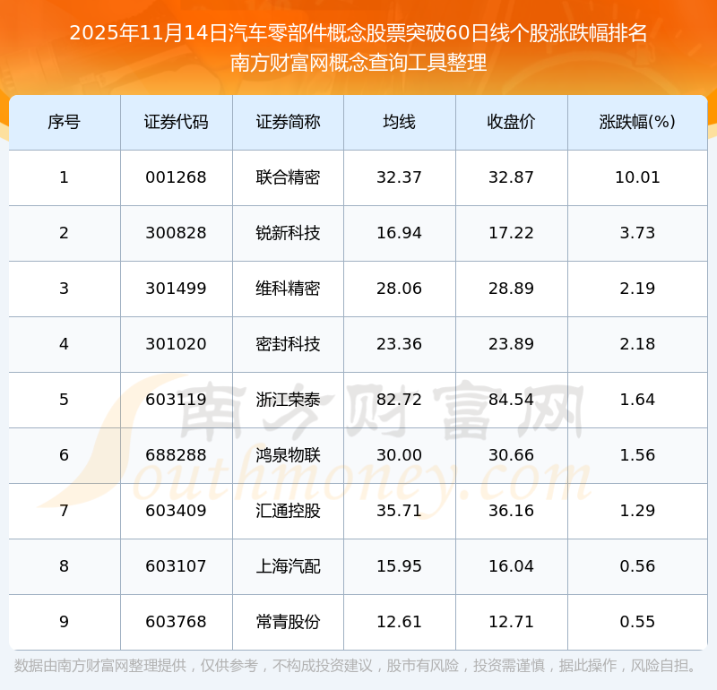 根據(jù)南方財富網(wǎng)概念查詢工具數(shù)據(jù)統(tǒng)計,截止2025年11月14日收盤,汽車零部件概念股票共有9只個股收盤價向上突破了60日線。其中漲幅較大的個股有聯(lián)合精密、銳新科技、維科精密等,漲幅分別為10.01%、3.73%、2.19%。