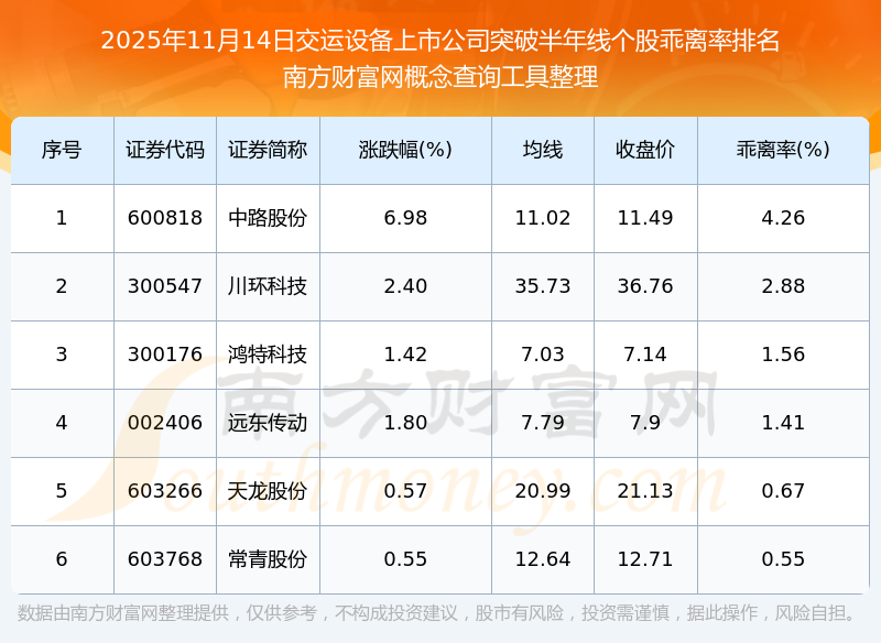 2025年11月14日交運(yùn)設(shè)備上市公司突破半年線個(gè)股乖離率排名