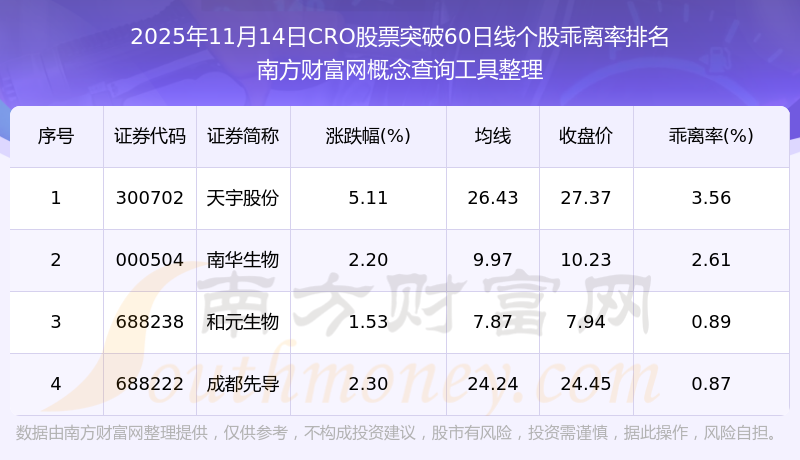 根據(jù)南方財富網(wǎng)概念查詢工具數(shù)據(jù)統(tǒng)計,截止2025年11月14日收盤,CRO股票共有4只個股收盤價向上突破了60日線。其中乖離率較大的個股有天宇股份、南華生物、和元生物等,乖離率分別為3.56%、2.61%、0.89%。