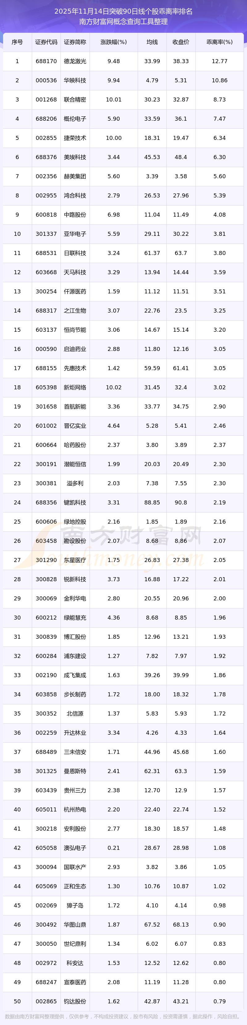 2025年11月14日突破90日線個(gè)股乖離率排名