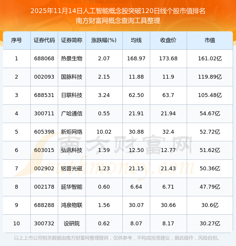 2025年11月14日人工智能概念股突破120日線個(gè)股市值排名