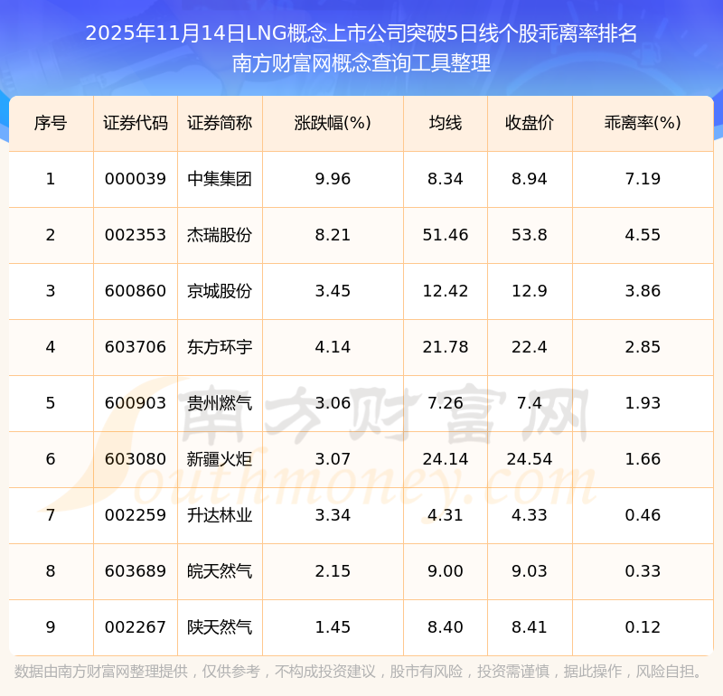 2025年11月14日LNG概念上市公司突破5日線個(gè)股乖離率排名