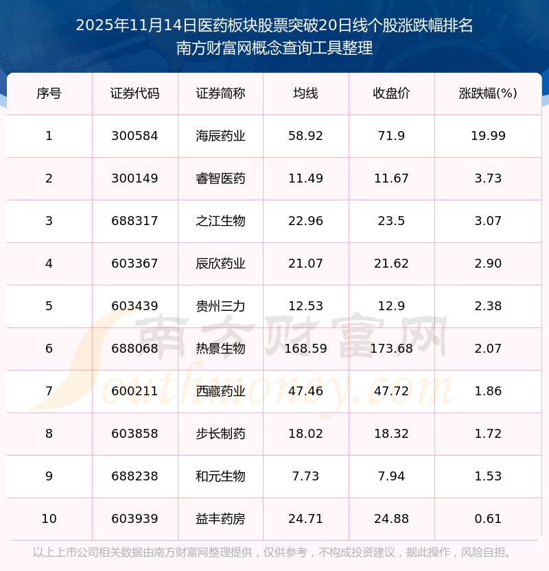 根據南方財富網概念查詢工具數據統(tǒng)計,截止2025年11月14日收盤,醫(yī)藥板塊股票共有13只個股收盤價向上突破了20日線。其中漲幅較大的個股有海辰藥業(yè)、睿智醫(yī)藥、之江生物等,漲幅分別為19.99%、3.73%、3.07%。