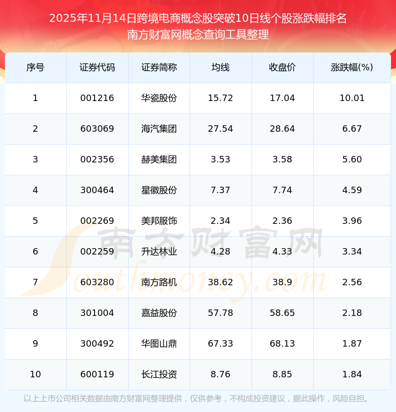 2025年11月14日跨境電商概念股突破10日線個(gè)股漲跌幅排名