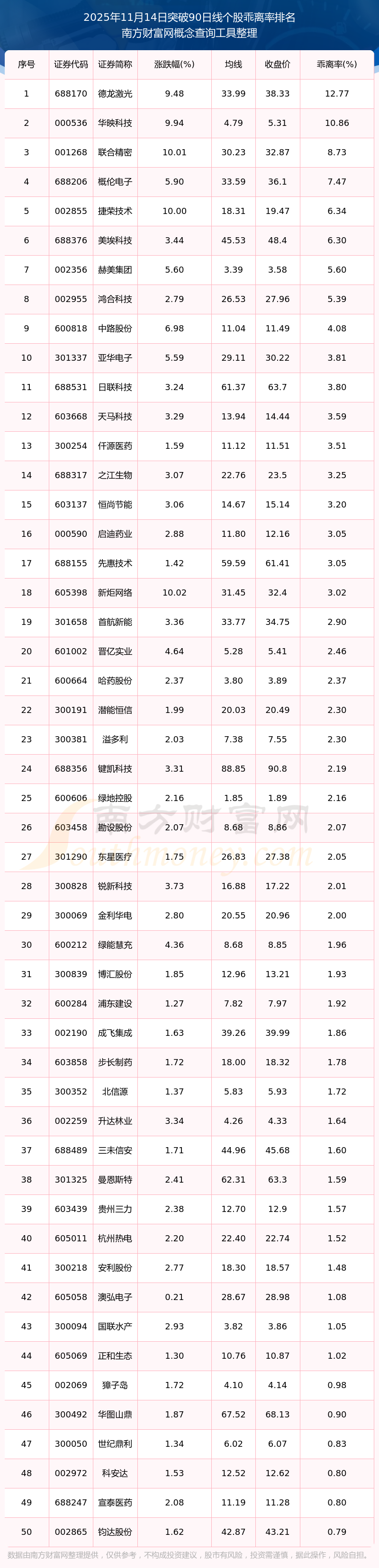 根據(jù)南方財富網(wǎng)概念查詢工具數(shù)據(jù)統(tǒng)計,截止2025年11月14日收盤,共有75只個股收盤價向上突破了90日線,其中乖離率較大的個股有德龍激光、華映科技、聯(lián)合精密、概倫電子、捷榮技術等,乖離率分別為12.77%、10.86%、8.73%、7.47%、6.34%。
