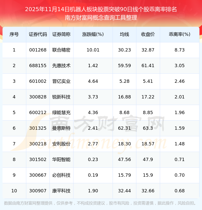 根據(jù)南方財富網(wǎng)概念查詢工具數(shù)據(jù)統(tǒng)計,截止2025年11月14日收盤,機器人板塊股票共有12只個股收盤價向上突破了90日線。其中乖離率較大的個股有聯(lián)合精密、先惠技術(shù)、晉億實業(yè)等,乖離率分別為8.73%、3.05%、2.46%。