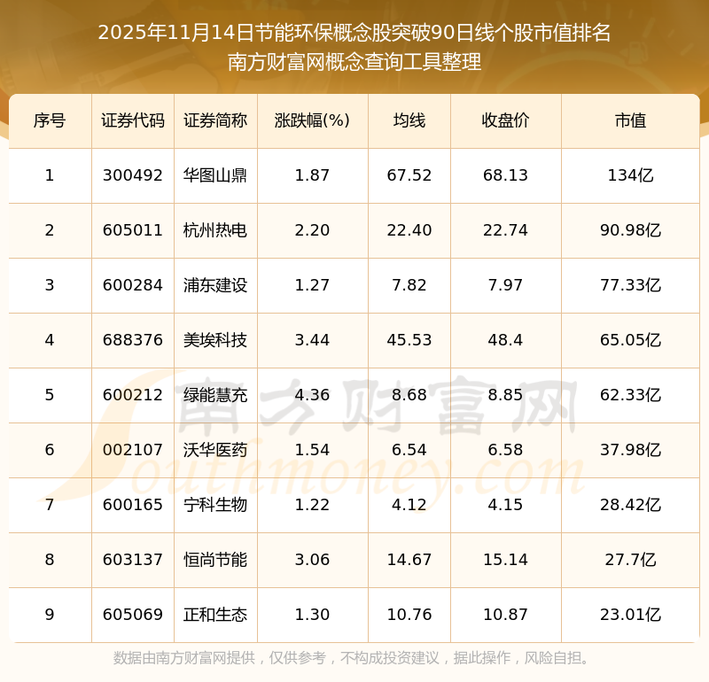 2025年11月14日節(jié)能環(huán)保概念股突破90日線個(gè)股市值排名