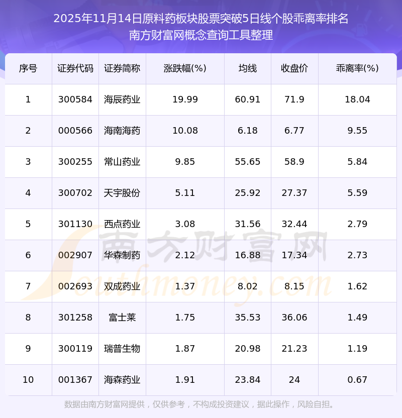 2025年11月14日原料藥板塊股票突破5日線(xiàn)個(gè)股乖離率排名