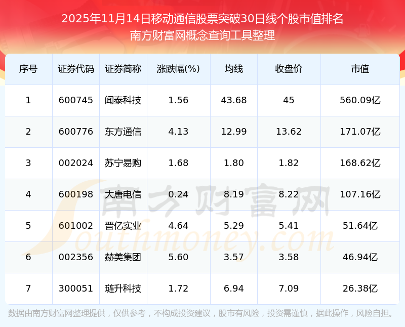 2025年11月14日移動通信股票突破30日線個股市值排名